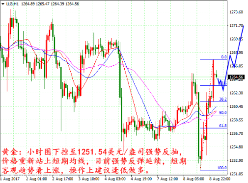 伦敦金(LLG):周线图对称三角整理,日线图整理区间向上运行,中长线趋势看震荡。昨日行情先抑后扬,日线报收带上下影线的中阳线,整体呈现V型反转态势。小时图下挫至1251.54美元/盎司强势反抽,价格重新站上短期均线,目前强势反弹延续,短期客观趋势看上涨,操作上建议逢低做多。